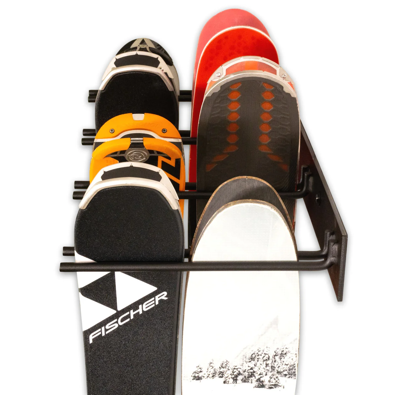 - Holds up to 8 pairs of skis, 2 pairs per slot